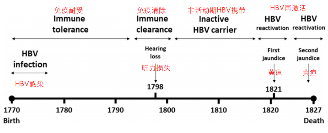 作者认为贝多芬在20多岁以前应该一直处于免疫耐受期,20多岁以后进入免疫清除、非活动性HBV携带阶段,50岁以后进入HBV再激活,并出现黄疸、腹痛、呕吐、腹水等症状。在≥50岁的男性个体中,HBV再激活的风险较高,这和贝多芬也是一致的。